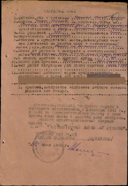 «Афанасьев, находясь на фронте борьбы с немецкими захватчиками с сентября 1941 г., в боях за социалистическую Родину, 3 раза пролил свою кровь и получил одну контузию.