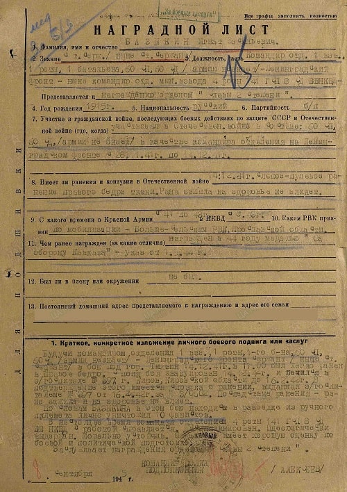 Будучи командиром отделения 1-го взвода 1-й роты 1-го батальона 60 мотострелкового полка 60 ТД (Армии не знает) Ленинградского фронта, сержант (ныне - старший сержант) в бою под городом Тихвин 14 декабря 1941 года в 11:00 был легко ранен в правое бедро.