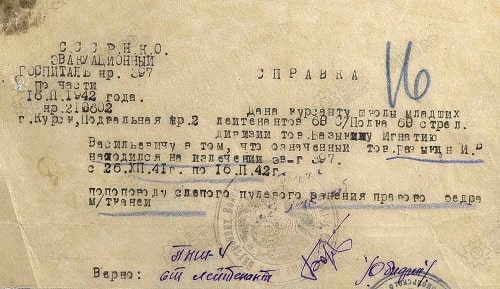 С поля боя был эвакуирован 14 декабря 1941 года и лечился в Эвакогоспитале Nº 397 в городе Киров Кировской области до 16 февраля 1942 года. В подтверждение этого имеется справка за Nº 3/0602. Последствия ранения: рана зажила и на здоровье не влияет.