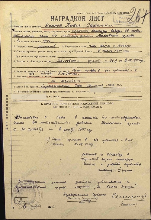 1. Ранен пулями в оба предплечья и в обе кисти 02 декабря 1941 года.