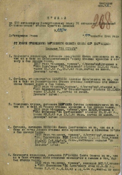 «Стрелка, сержанта Веселова Ивана Дмитриевича за то, что он в боях за город Ленина проявил себя мужественным и отважным бойцом и был дважды ранен»