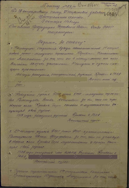 Справка: воин «Боровский Константин Алексеевич 1916» мл. сержант, ком. отделения, награждён МЕДАЛЬЮ «ЗА ОТВАГУ»