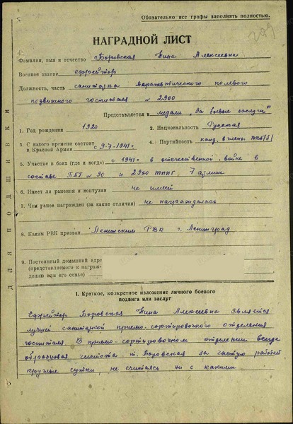 Справка: воин «Боровская Нина Алексеевна (Голыничева 1920» ефрейтор, санитарка, награждён МЕДАЛЬЮ «ЗА БОЕВЫЕ ЗАСЛУГИ»