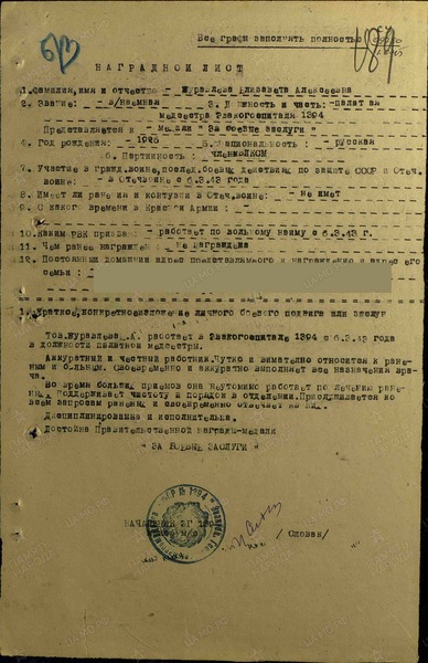 Справка: воин «Журавлева Елизавета Алексеевна (Макаренко 1925» палатная медсестра, вольнонаемная, награждена МЕДАЛЬЮ «ЗА БОЕВЫЕ ЗАСЛУГИ»