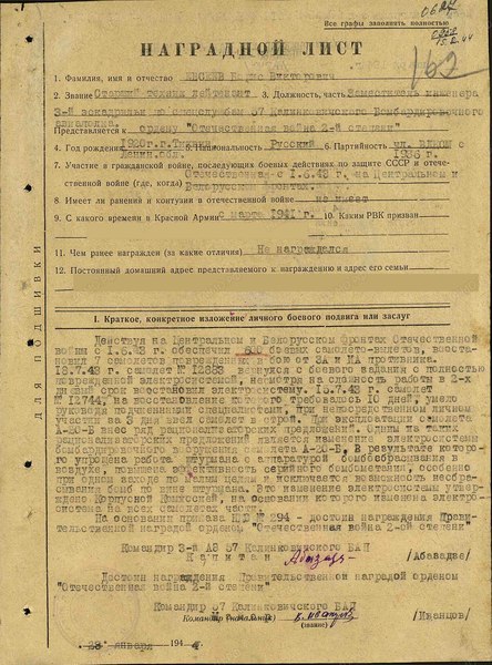 На основании приказа НКО № 294 достоин награждения правительственной наградой - ОРДЕНОМ ОТЕЧЕСТВЕННОЙ ВОЙНЫ 2 СТЕПЕНИ»