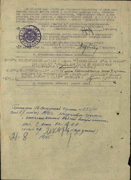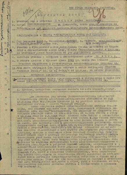 «За внесенный ряд рационализаторских предложений и безотказную работу электроспецоборудования эскадрильи 57 БАП 18.03.1944 года, тов. Евсеев приказом 16 ВА удостоен первой правительственной награды – ОРДЕНА КРАСНОЙ ЗВЕЗДЫ.