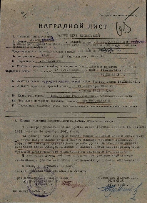 Товарищ Сагрин участвовал на фронте Отечественной войны с 15 октября 1941 года по 14 декабря 1941 года.