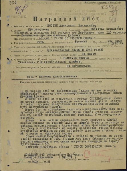 Когда стала задача форсировать реку Одер, тов. Костин первым побежал по тонкому льду на другой берег и несмотря на сильный артминометный и пулеметный огонь противника, форсировал реку и закрепившись на берегу противника, открыл сильный пулеметный огонь, обеспечив переправу батальона, а затем полка в целом на вражеский берег.