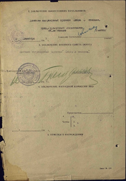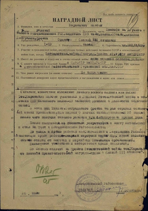 За боевые отличия на фронте Отечественной войны товарищ Каражанов достоин правительственной награды Ордена Славы III степени.
