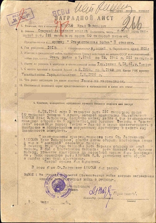 Танк командира роты Амосова И. Ф. уничтожил одно орудие и подбил один танк противника.