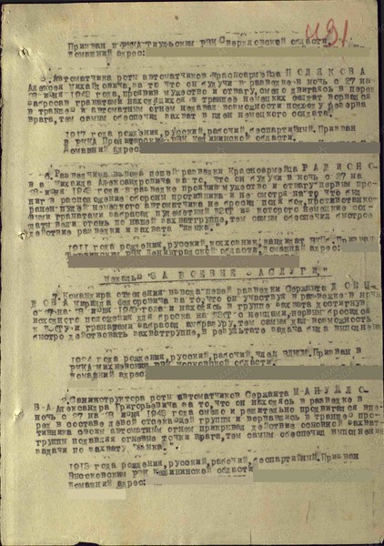 Справка: воин «Радионов Михаил Александрович (Родионов 1911» красноармеец, разведчик, награждён МЕДАЛЬЮ «ЗА ОТВАГУ»