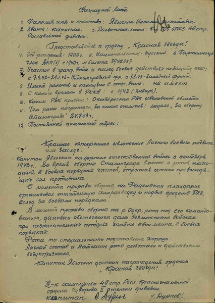 Справка: воин «Яблочкин Николай Михайлович 1908» капитан, командир 505 орхз 49 стр. Рославльской дивизии, награждён ОРДЕНОМ КРАСНОЙ ЗВЕЗДЫ
