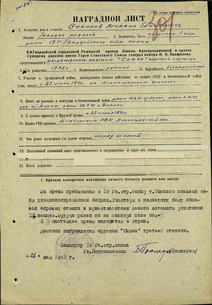«За время пребывания в 19 гв. стр. полку т. Соколов показал себя дисциплинированным бойцом.