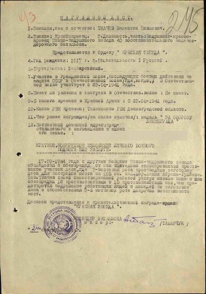 Справка: воин «Ткачев Валентин Павлович 14.06.1917» красноармеец, (в учётной карточке ефрейтор), подрывник, награждён ОРДЕНОМ КРАСНОЙ ЗВЕЗДЫ