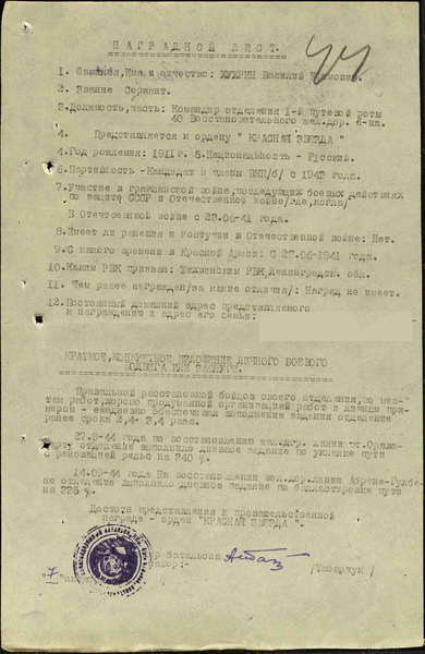 «Правильной расстановкой бойцов своего отделения по местам работ, хорошо продуманной организацией работ и личным примером ежедневно обеспечивал выполнение задания отделением ранее срока 2,4-3,4 раза.