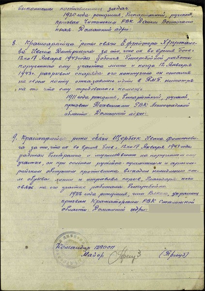 «Красноармейца роты связи, ефрейтора Хрусталева Ивана Дмитриевича за то, что он во время боев с 12 по 17 января 1943 года добился бесперебойной работы порученного ему участка линии и когда 12 января 1943 г. разрывом снаряда его контузило, он остался на своем посту, отказавшись идти в ПМП, несмотря на то, что ему требовалась помощь»