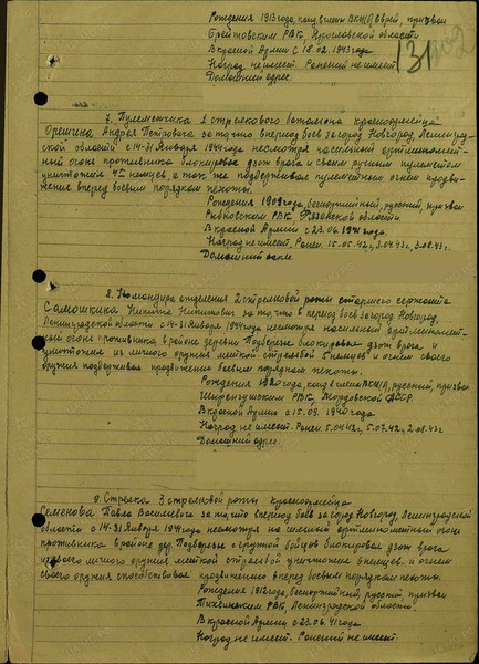 Справка: воин «Семенов Павел Васильевич 1912» красноармеец, стрелок, награждён МЕДАЛЬЮ «ЗА ОТВАГУ»