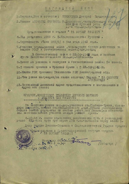 «На восстановлении жел. дор. участков ст. Гулбене-Ерики благодаря хорошему знанию железнодорожного дела, умелой расстановке бойцов своего отделения по местам работ, тов. Никаноров обеспечивал восстановление участка взвода раньше срока.