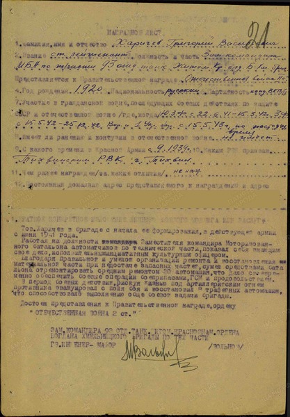 Справка: воин «Харичев Григорий Васильевич 1920» гв. капитан, зам. ком., награждён ОРДЕНОМ ОТЕЧЕСТВЕННОЙ ВОЙНЫ 2 СТЕПЕНИ