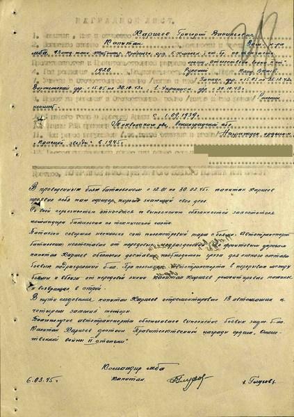 «В проведенных батальоном боях с 12.01 по 30.02.1945 г. капитан Харичев проявил себя как офицер, хорошо знающий свое дело.