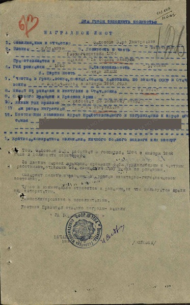 Справка: воин «Федосова Вера Дмитриевна 1923» санитар, вольнонаемный, награждена МЕДАЛЬЮ «ЗА БОЕВЫЕ ЗАСЛУГИ»