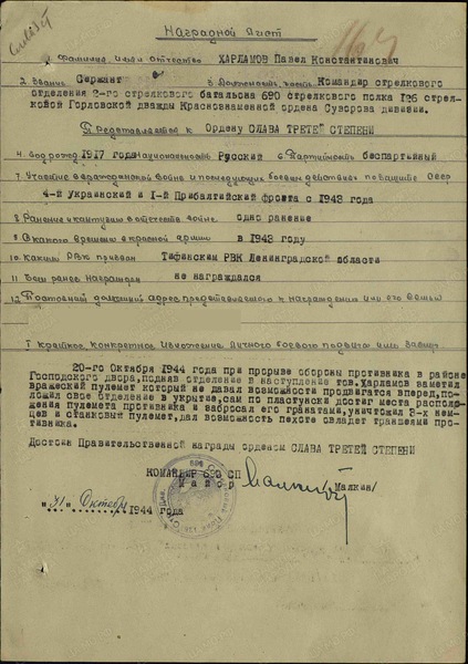 Справка: воин «Харламов Павел Константинович 1917» сержант, ком. стр. отделения, награждён ОРДЕНОМ СЛАВЫ 3 СТЕПЕНИ
