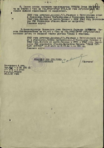 Справка: воин «Харламов Павел Константинович» ст. сержант, старшина батареи, 690 сп 126 сд, награждён Медалью «За взятие Кенигсберга»