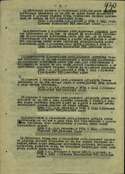 «Пулеметчика 3 стрелковой роты, ефрейтора Большева Алексея Антоновича за то, что, невзирая на огромность расстояния преследования противника, свыше 300 клм, не отставая, стремительно его преследовал и будучи неоднократно в боевом охранении, своим огнем уничтожил наблюдательный пункт противника»