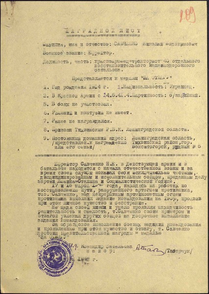 «Ефрейтор Савченко Н.Е. в действующей армии и в батальоне находится с начала Отечественной войны и за время своей службы показал себя исключительно честным, дисциплинированным и исполнительным бойцом, преданным делу партии Ленина-Сталина и социалистической Родине.