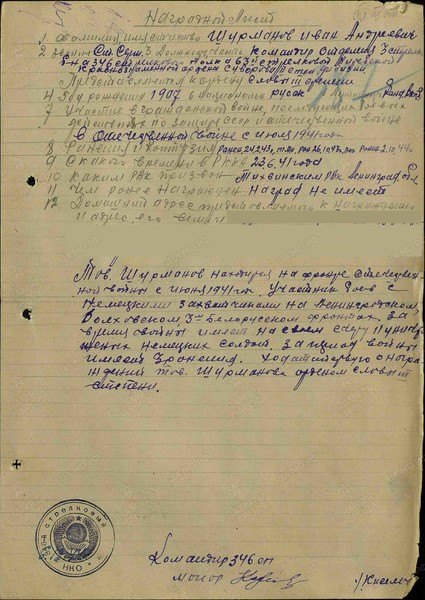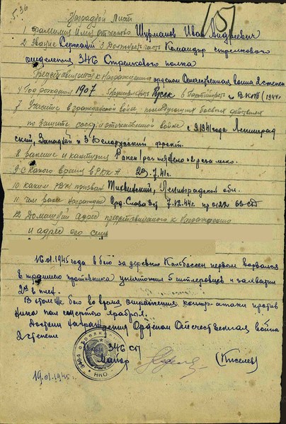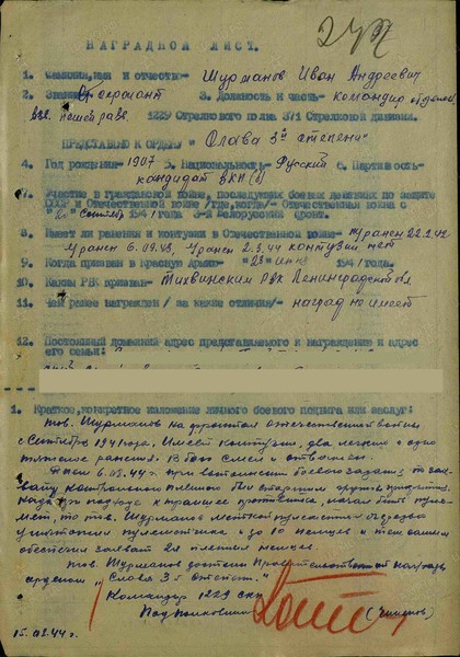 Справка: воин «Шурманов Иван Андреевич 1907» ст. сержант, ком. отд., награждён ОРДЕНОМ СЛАВЫ 3 СТЕПЕНИ