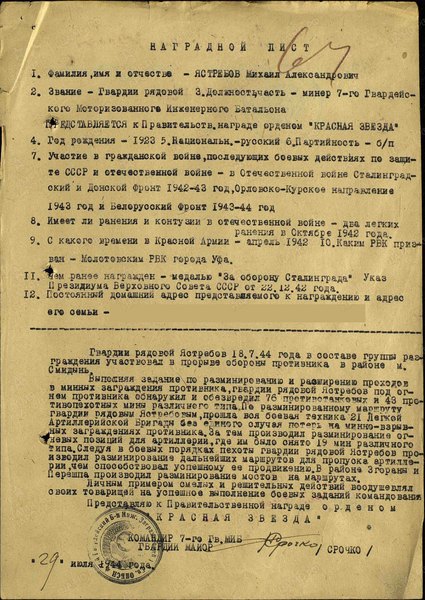 Справка: воин «Ястребов Михаил Александрович (Алексеевич 1923 (1922» гв. красноармеец, минёр, награждён МЕДАЛЬЮ «ЗА ОТВАГУ» (в наградном листе представлялся к Ордену Красной Звезды)