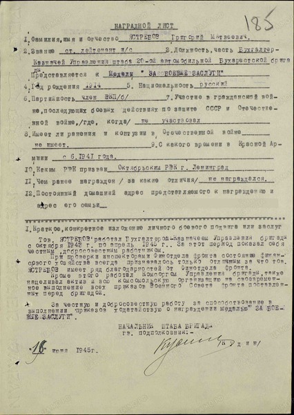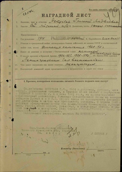 «Ст. лейтенант Ястребов Г.М., 1914 г. рождения, русский, член ВКП(б), образование среднее, в Красной Армии служил с перерывами с 1936-1937, с 1939-1940 г., с июня 1941 года на административно-хозяйственных должностях.