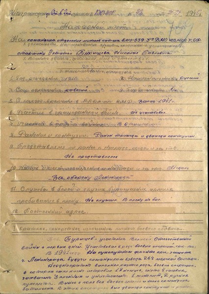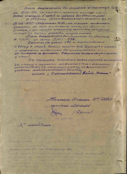За образцовое выполнение боевых заданий командования, за отвагу и мужество, проявленные в боях с немецкими захватчиками, за образцовую работу на судоремонте достоин правительственной награды - ОРДЕНА ОТЕЧЕСТВЕННОЙ ВОЙНЫ 1 СТЕПЕНИ»