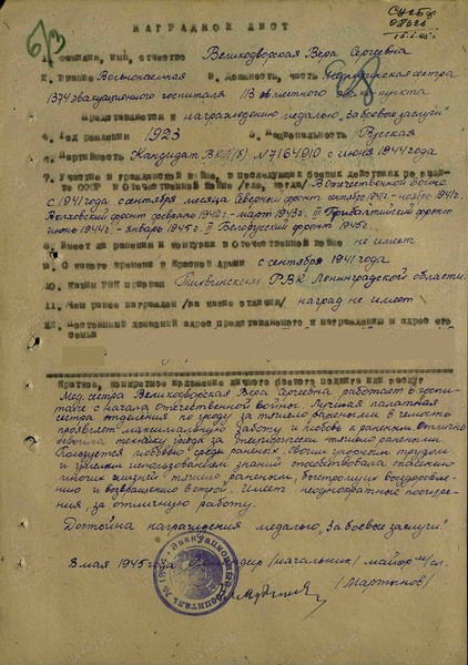 Справка: воин «Великодворская Вера Сергеевна 1923» медсестра, вольнонаёмная, сержант, награждена МЕДАЛЬЮ «ЗА БОЕВЫЕ ЗАСЛУГИ»