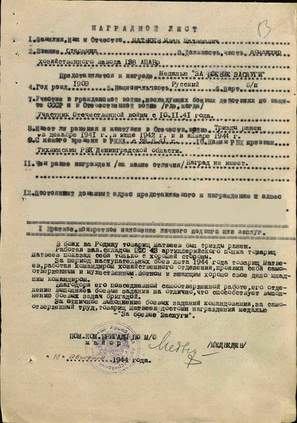 За отличное выполнение боевых заданий командования, за самоотверженный труд товарищ Матвеев достоин награждения — МЕДАЛЬЮ «ЗА БОЕВЫЕ ЗАСЛУГИ