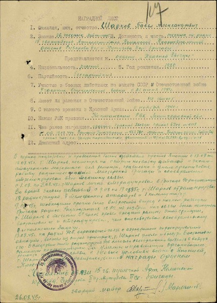 Справка: воин «Шарков Павел Александрович» гв. ст. лейтенант, радиотехник, 15 гв. пабр, награжден Медалью «За взятие Кенигсберга»