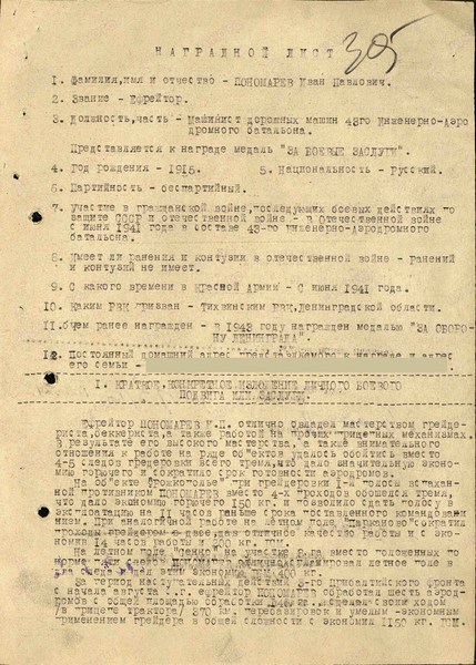 Справка: воин «Пономарев Иван Павлович 1915» ефрейтор, машинист дорожных машин, награждён МЕДАЛЬЮ «ЗА БОЕВЫЕ ЗАСЛУГИ»