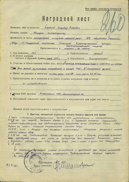 Справка: воин «Горячев Виктор Егорович 1914» сержант (гв. сержант, бывший ком. отд. связи, награждён ОРДЕНОМ КРАСНОЙ ЗВЕЗДЫ, (в наградном листе представлялся к Ордену Славы 3 Степени), находящегося на излечении в ЭГ № 1249 г. Новосибирска
