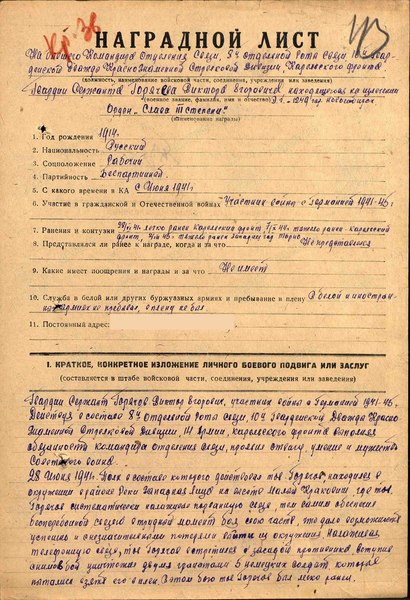 Справка: воин «Горячев Виктор Егорович 1914» гв. красноармеец, (в учётной карточке ст. сержант), телефонист, награждён МЕДАЛЬЮ «ЗА ОТВАГУ»