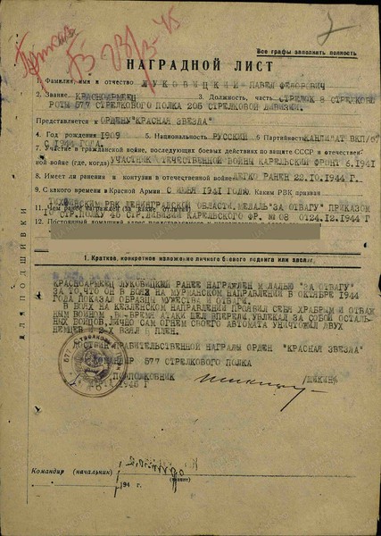 «Красноармеец Луковицкий ранее награжден Медалью «За Отвагу», за то, что он в боях на Мурманском направлении в октябре 1944 года показал образцы мужества и отваги.