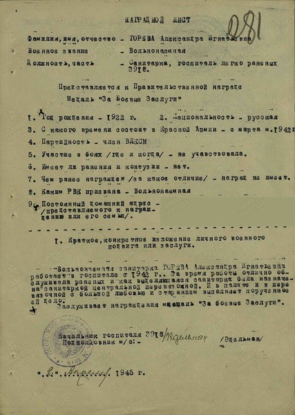 Справка: воин «Горева Александра Игнатьевна 1922» вольнонаемный, санитарка, награждена МЕДАЛЬЮ «ЗА БОЕВЫЕ ЗАСЛУГИ»