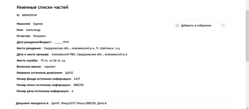 Удалов Александр Петрович 1919 ЖИВ ранен х 4 п 22027386 п 33799636 пр.б/в 29.12.1941 в/ч 8403, 60 АП, 60 ТД 51882197 411654836 ВПП 1987945642 DOKST нет