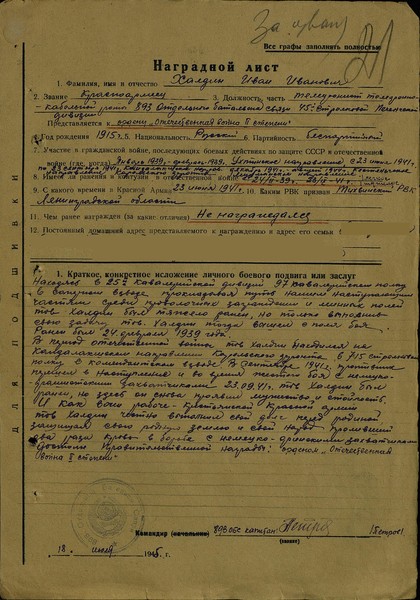 Справка: воин «Халдин Иван Иванович 1915» красноармеец, телефонист, награждён МЕДАЛЬЮ «ЗА ОТВАГУ» (в наградном листе представлялся к Ордену Отечественной Войны 2 Степени)