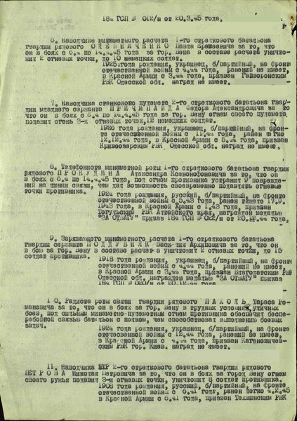 «Наводчика ПТР 2-го стрелкового батальона, гвардии рядового Петрова Николая Петровича за то, что он в боях за город Вену огнем своего ружья подавил 3 огневых точки, уничтожил 8 солдат противника»
