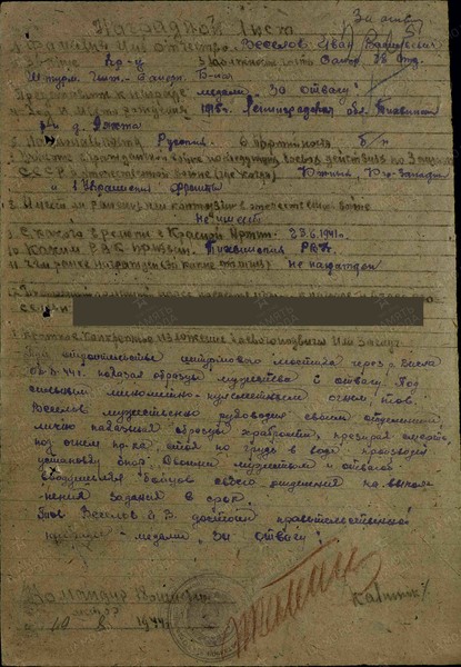 Под сильным минометно-пулеметным огнем тов. Веселов мужественно руководил своим отделением, лично показывая образцы храбрости, презирая смерть, под огнем пр-ка, стоя по грудь в воде, производил установку опор.