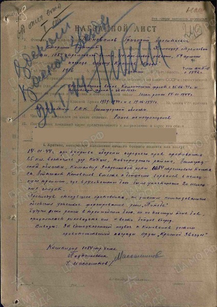 Справка: воин «Коновалов Григорий Арсентьевич (Арсеньевич 1916» ст. лейтенант, ком. стрелковой роты, награждён ОРДЕНОМ КРАСНОЙ ЗВЕЗДЫ