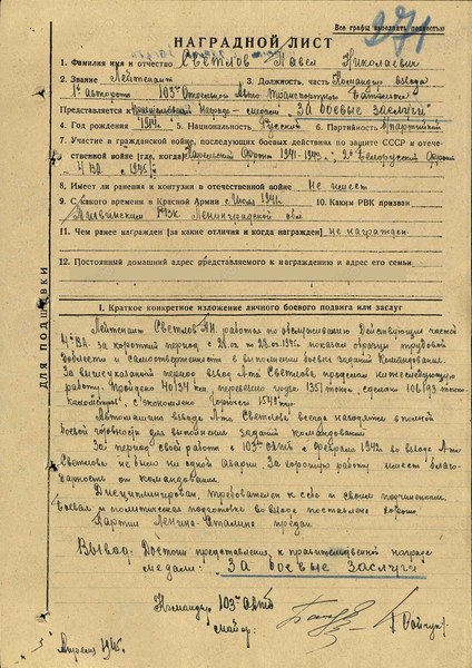 «Лейтенант Светлов П.Н., работая по обслуживанию действующих частей 4 ВА за короткий период с 28.02 по 28.03.1945 г. показал образцы трудовой доблести и самоотверженности в выполнении боевых заданий командования.
