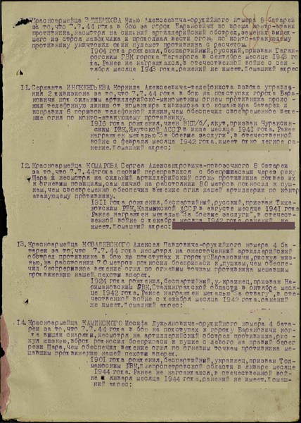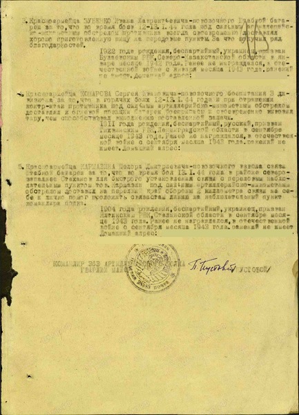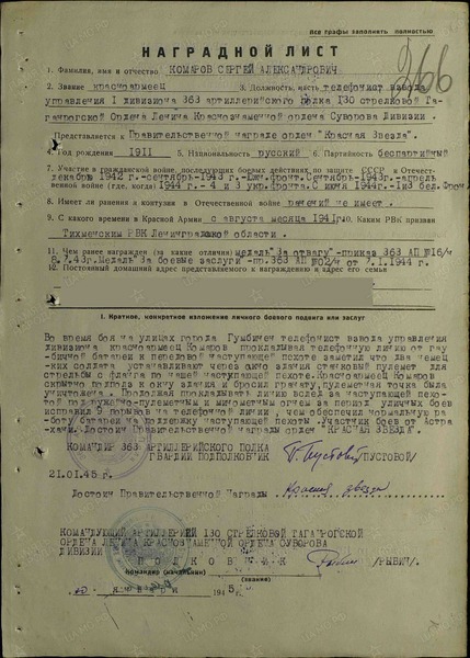 «Красноармейца Комарова Сергея Ивановича, повозочного боепитания 3 дивизиона за то, что в горячих боях 12-13.01.1944 года и при отражении контратак противника под сильным артиллерийско-минометным обстрелом доставлял к огневой позиции батареи боеприпасы и своевременно вывозил тару, чем способствовал выполнению поставленной задачи»