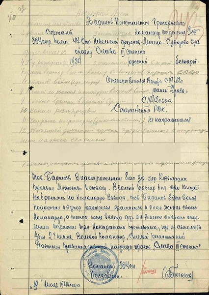 Справка: воин «Баринов Константин Григорьевич 1924» сержант, ком. отделения, награждён ОРДЕНОМ КРАСНОЙ ЗВЕЗДЫ (в наградном листе представлялся к Ордену Славы 3 Степени)