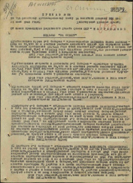 Справка: воин «Зернов Василий Павлович 1916 (1915» ст. сержант, парторг, награждён МЕДАЛЬЮ «ЗА ОТВАГУ»